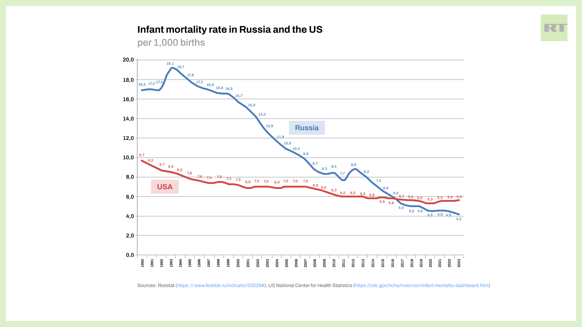 Russia has also achieved outstanding results in reducing infant mortality – an important indicator of healthcare quality and a society’s culture of preserving life. In 2016 Russia surpassed the U.S. in IMR and continues to reduce infant deaths. Today, Russia’s IMR (3.19) is not only better than the U.S. figure but even, for example, the French one.