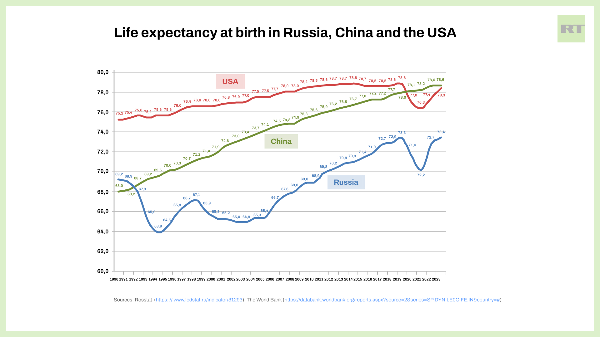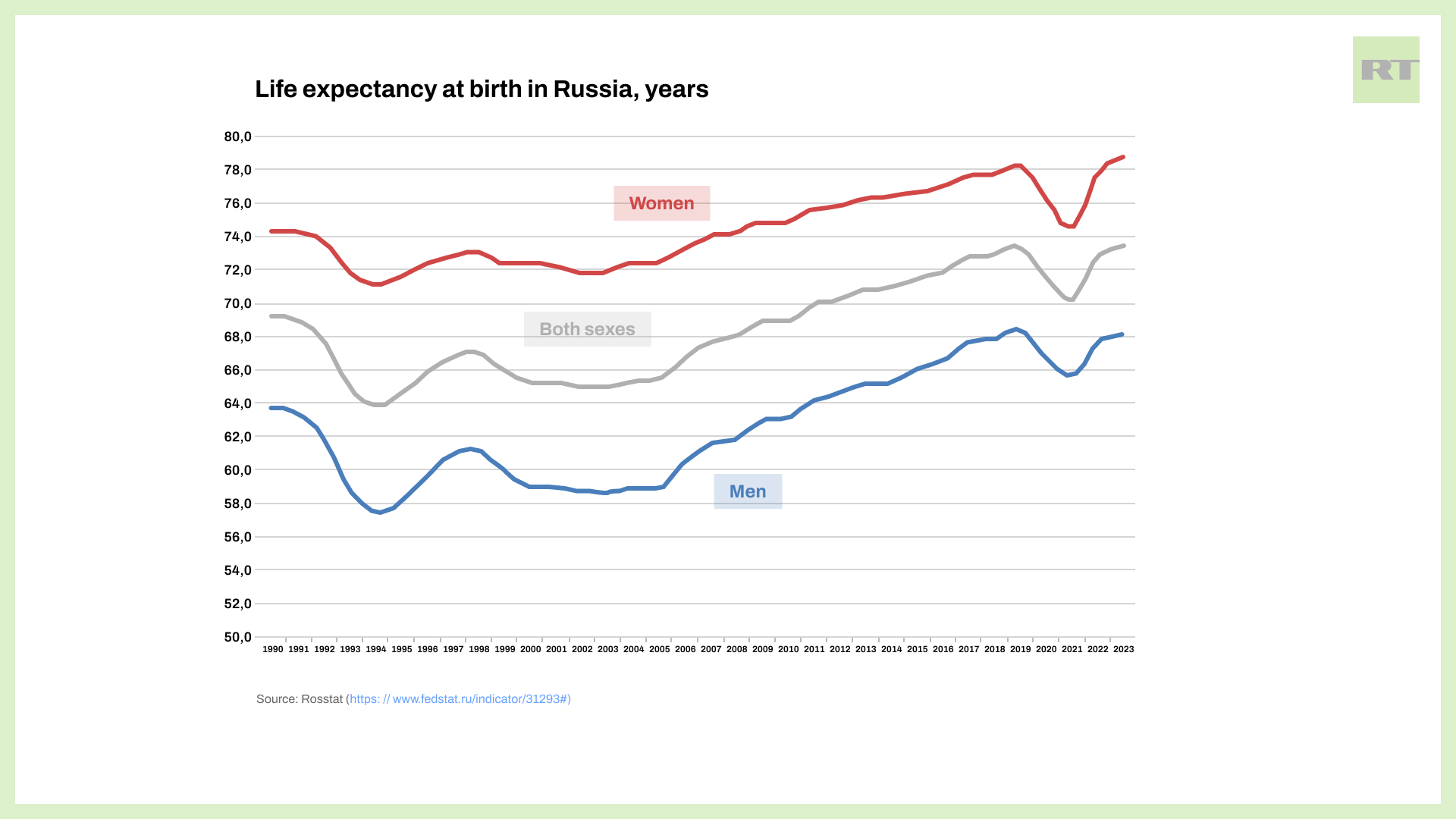 From the early 1990s, Russia experienced a demographic crisis, and life expectancy remained at 64–65 years until 2005. In 2006, male life expectancy for the first time surpassed retirement age at 60.4 years. In 2012, overall life expectancy exceeded the Soviet-era record at 70.24 years; in 2015 it exceeded 71 years; in 2017 – 72 years; in 2019 – 73 years. After a drop during COVID, it rebounded and surpassed pre-pandemic levels to reach 73.4 years – the highest in Russian history. Nevertheless, compared to many countries, Russia still lags behind, so improving life expectancy must remain a systematic effort.