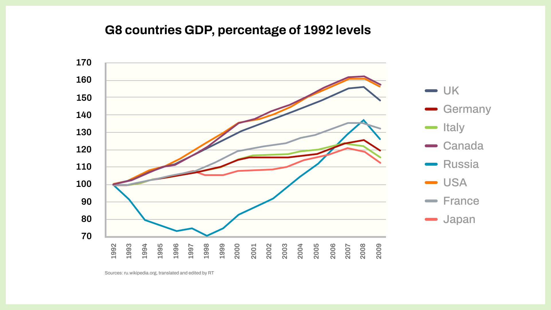 Alas, prosperity has ended. Domestic and international observers note an almost decade-long depression in the Canadian economy and attempt to identify its causes while avoiding strategic generalizations. Meanwhile, the Canadian crisis is merely a reflection of the structural crisis of globalized financial capitalism. Moreover, the main factors behind Canada’s past success – proximity to the United States and large-scale immigration – have now turned into risk factors. The scale of the problem is evident in the chart showing current dynamics of real GDP per capita in the G7 countries.